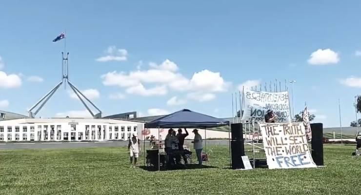 Speakers shouted into a megaphone with the usual false claims and conspiracies — everything from the sovereign citizen-inspired belief that Australia’s federal Parliament is illegitimate, to the dangers of COVID-19 vaccination. While people led chants about mRNA vaccines, children ran around and some participants sat under marquees to shield themselves from the harsh Canberra summer sun.