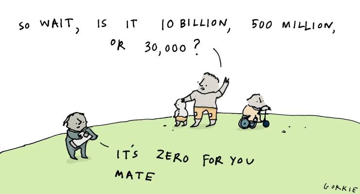 The Greens could then counter that the increased cost deficit would be worth it to spend some serious money to make inroads into the particular shortfall of social and public housing, and the general shortfall overall. It could acknowledge that the government has a cunning superannuation plan to fill the private sector provision gap, but also point out that without coercive powers, it’s another Jimbo thought bubble about values-led impactful investment. Wouldn’t it be great to have that debate, with some cost-benefit stuff, rather than Labor’s nonsense rhetoric and the Greens’ mild spin?