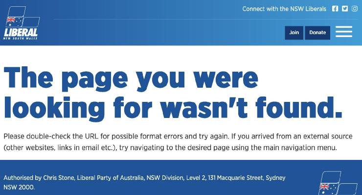 A NSW Liberal Party website 404 page that formerly held a statement about Gladys Berejiklian's resignation (Image: NSW Liberal Party)