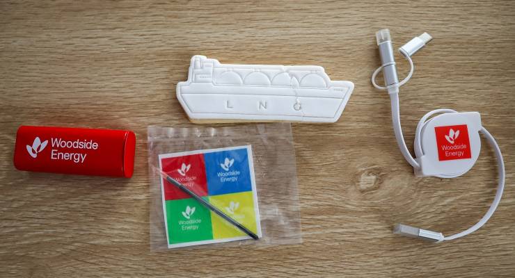 - A phone charger with USB-B, USB-C and iPhone charging ports, also emblazoned with the Woodside Energy logo. Woodside loves to make a lot of noise about how its gas “keeps the lights on”’” in Western Australia, even though most of it is exported. But if you were to see the Woodside logo every time you plugged your phone in, it might help convince you that you needed a war-profiteering fossil gas enterprise to enjoy the basics of daily life.