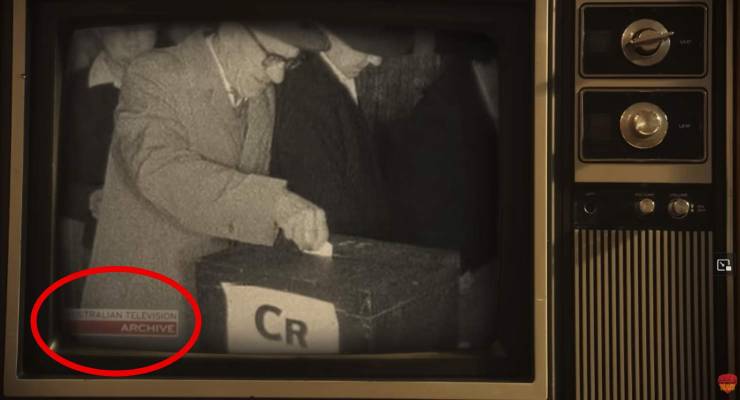 Keen-eyed viewers can spot a red-and-white anachronistic logo in the bottom-left corner of the footage. It belongs to the Australian Television Archive, an archival and video digitisation company run by James Paterson (not the Liberal senator).