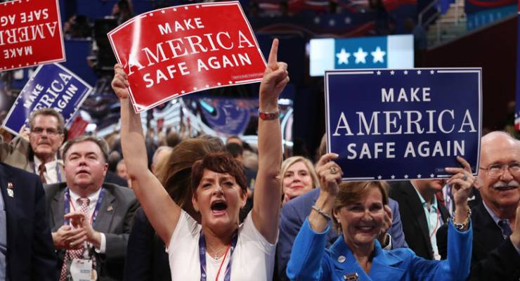 In the broad belly of Quicken Loans Arena, all in red, white and blue, men and women were getting to their feet, shaking their fists and setting up a chant stomp. “Count the votes.” Goold ole boys, 300 pounds in beige blazers, brown cords and sky blue shoes, women in perms of 1967 and summer dresses with elephant patterns running across them, standing, shouting. Sprog conservatives, young men in blue suits, red ties and white shirts, standing, banging signs on the metal steps.