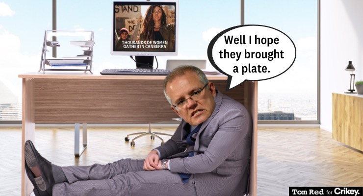 Morrison, who hasn’t had enough time to plan a strategic photoshoot, instead sent in Superannuation Minister Jane Hume to try to convince March 4 Justice organiser Janine Hendry to meet him privately.