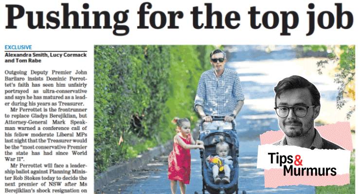 Taking the leadership As day follows night, a leadership battle in a major party is followed by humanising coverage of the protagonists on the front pages of the major papers. And so we get Dominic Perrottet and two of his children in The Sydney Morning Herald (maybe he misplaced the other four?).