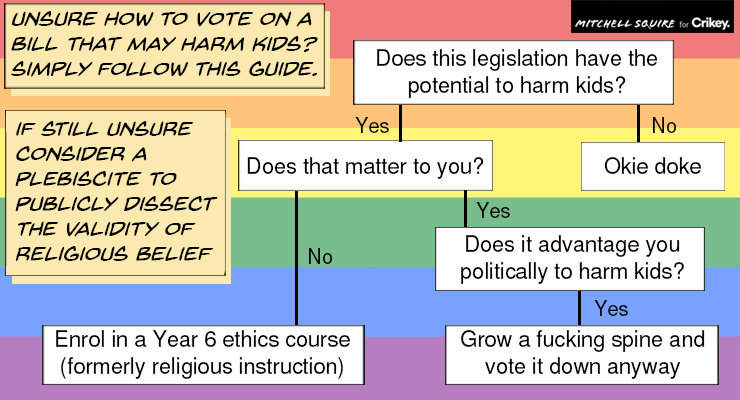 Yesterday the Coalition reached some degree of consensus — but barely. The partyroom agreed to introduce the bill with minor amendments, as well as a change to s38(3) of the Sex Discrimination Act which would remove the ability of religious schools to expel gay students but crucially still allow them to engage in other forms of discrimination. Transgender kids could still be expelled, despite Morrison’s earlier promise to provide protection against discrimination based on gender identity.
