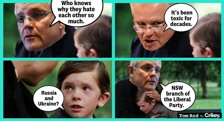 As Crikey reported previously, the current situation has its roots in a long-simmering, arcane factional dispute between the right, the moderates and the centre-right. The latter, represented by Morrison and his factional consigliere, Immigration Minister Alex Hawke, have been marginalised in NSW by a loose alliance between the mods and the right.